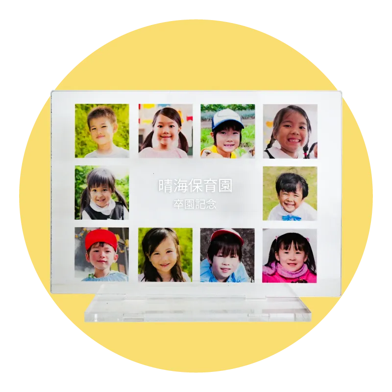 集合写真を大きく1枚入れることもできます。自由にテキストを入れることもできて、まさに記念品にぴったりの一品。